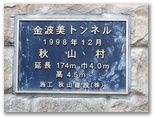 車道を歩くこと約45分、秋山が飽き山になる前に、金波美トンネルに到着しました。銘板の文字が金色に輝いています。全長174m。幸い、出口が見えています。照明はありませんが、両端から光が入るので大丈夫でしょう。もし車が来ると怖いので、自分がよく見えるようにトンネルの中心線を歩きました。一人トボトボと ... 光に向かって ... トンネルを抜け一安心。振り返ると、トンネルに向かって左に、金波美峠への登り口がありました。さっそく山道に取り付きます。