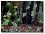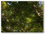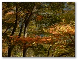 井戸沢ノ頭手前の鞍部では、濃い朱色のモミジも見られました。よく見ると、緑色から朱色までのグラデーションがきれいです。小峰に登り返すと、そこが井戸沢ノ頭。丸木の椅子がずらり並べてあります。ここで少し遠回りになりますが、右に分岐する金剛山への道に進みます。しばらく急勾配を下ると、すぐに平坦な道になりました。この辺りには、まだ緑色のモミジがありましたが、いつ紅葉するのでしょうか?見上げると、葉と葉の重なりにできる影がきれいでした。