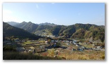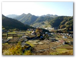 その展望の中で、最もすてきだと思ったのは、まるで絵本の絵のような、富岡の田園風景です。晩秋の空気、和風の民家、色分けされた棚田、双耳峰めいたデン笠と金比羅山、その背景には豊穣感のある高柄山。できれば四季ごとに、ここで定点撮影してみたいと思いました。何度も何度もシャッターを切っていたら、ついに電池切れ。予備電池を ... 何と、忘れてきました。あとは瞼に焼き付けるのみです。雪降る里、桜咲く里、緑深い里、黄金色の里を想像しながら。