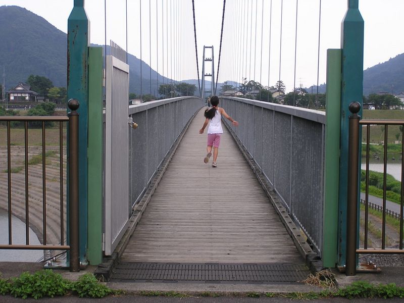 -- つり橋の中央へ。