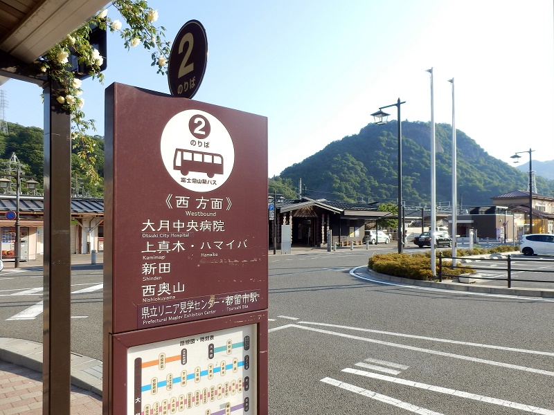 -- 大月駅前ロータリー。右は岩殿山。6:44