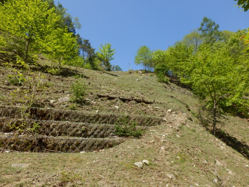 -- 堰堤の左の法面を登る。すぐ上に林道。9:46
