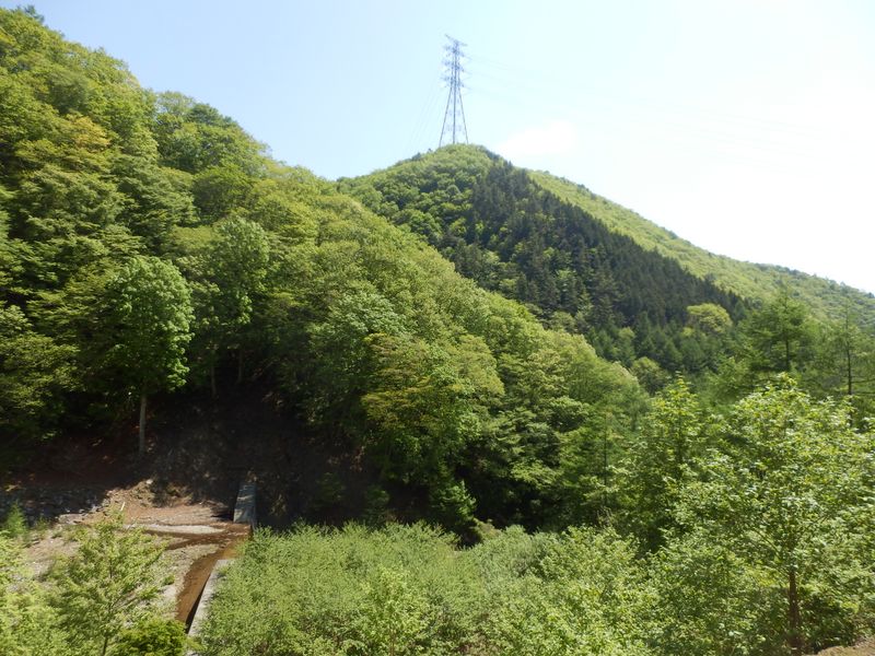 -- 大久保山と鉄塔18号と先ほどの堰堤。9:50