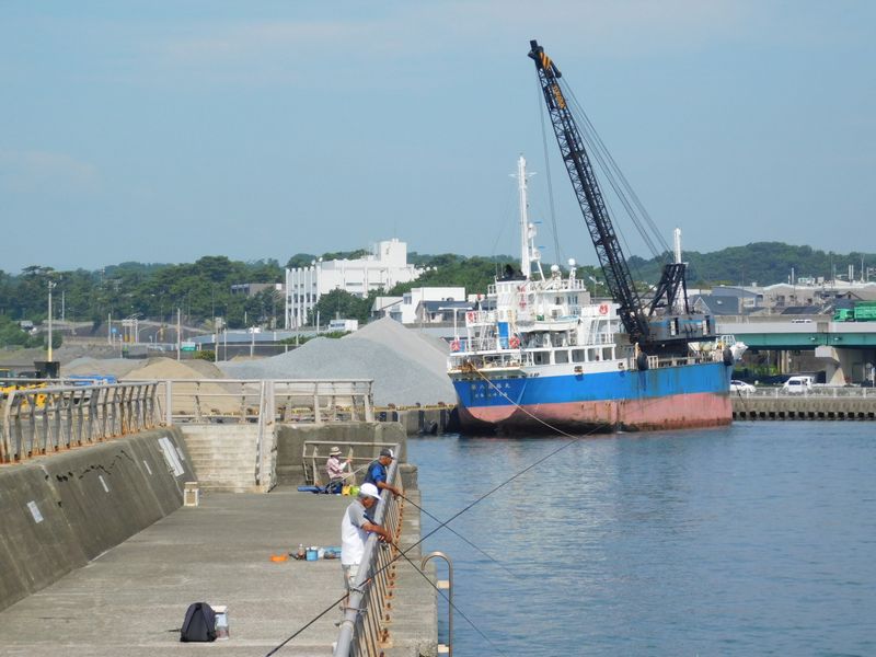 -- 防波堤の釣り場。砂利運搬船が荷揚げ中。