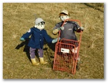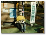 三峰口駅に到着。バスが発車するまで45分ほどあるので、贄川宿のかかしを見に行きます。白川橋で荒川を越え、国道140号を右に少し進むと、すぐに「かかしの里」の標識と、男女2体のかかしがありました。矢印に従って贄川宿に向かいます。観光トイレの横、「秩父御岳山登山口」に座っている人もかかしです。以後、バスが来るまで、急いでたくさんのかかしを見ました。人の姿はありません。「かかしも里のにぎわい」かな?ところで夜はどうするのでしょうか?