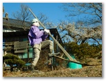 薬師堂コースのクサリつき岩場は、しばしば渋滞しました。もともと片側相互通行の狭い登山路に、多くのハイカーが押し寄せたのですから、仕方がありません。でも両神神社奥社から男坂までは、一気に下ることができました。他のハイカーたちに倣い、ロウバイ園と武甲山とを同時に眺められる斜面に腰を下ろし、しばしティータイム。それにしても、これは何というのどかさ! 身の引き締まる岩場と、ゆったり心解ける花の園地。いずれも四阿屋山の魅力です。