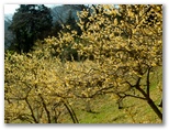 30分ほど歩いて林道を横断し、さらに登山道を10分ほど登ると、三叉路がありました。古びた道標があり、右は展望広場、左は山居広場と読めますが、福寿草園の文字はありません。どちらに進むか、ここで思案していた二人連れと一緒に考え、山居広場に向かいました。山居は「さんきょ」と読みます。シダの多いトラバース道を1~2分進むと、明るいロウバイ林に飛び出しました。展望、日当たり、色彩、香り、開放感、すべてそろった花の園地です。