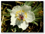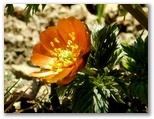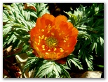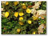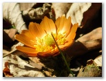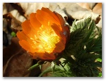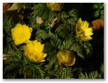 透き通るような黄色、丸く可愛らしい花。ソシンロウバイでしょう。まだまだ見頃です。私はこの花がほんのりと香るときは好きですが、ロウバイ園の強すぎる香りはどうも苦手。素早く通り抜け、フクジュソウを見に行きました。斜面の見学路を少し下ると、あるある!たくさん咲いています。時刻は10時15分。フクジュソウの花はパラボラアンテナのようにしっかり開いて、太陽光をキャッチ。オレンジ色の「秩父紅」も、数はわずかですが、初めて見れて感激しました。