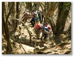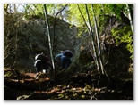 山居の福寿草園から、節分草園に向かいます。「節分草園まで急な山道↑約60分」と書かれた標識から、山腹を巻いて行きます。20分弱でつつじ新道と出合いました。そこはクサリ付き岩場のすぐ下で、「これより上級者コース」「初級者は山居方面へ迂回してください」などの注意書きがあります。ここで女性三人組がクサリ付き岩場に取り付こうとしていました。人の装備を見れば、ある程度は登攀力の見当がつくものです。心配なので、しばらく見守っていました。