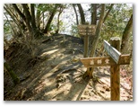 そのすぐ先に、直登ルートのような尾根がありましたが、通行禁止。危険箇所があるのでしょう。左から回り込む一般登山道の方も、クサリつきの岩場になりました。ただ登り下りするだけなら、手足をかけられる岩も多く、掴める木の根もあったりして、難度は低いと思われます。しかし登山路がとても狭いので、すれ違い時にはしっかり安全を確保し、譲り合うことが必要です。また落石があった場合、逃れる場所がありません。かなり緊張しました。