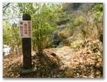 小鹿野町営バスで、薬師の湯に来ました。運賃は秩父市の荒川地区ゾーンが一律200円、小鹿野町内の分が一律200円。計400円です。登山口はいくつかあるようですが、薬師堂を表敬し、その境内を出発地点としました。身支度を整え、まず山腹の福寿草園を目指します。広い車道を上ってまもなく、鳥居山コースを右に分け、花菖蒲園を左に見ると、左下の沢を指す小さな道標がありました。これさえ見逃さなければ、あとは一本道。道標も要所要所に立っています。