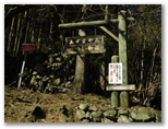 福寿草園で30分ほど過ごしました。山居の案内休憩舎に行って見ます。ここでハイキングマップと節分草園のパンフレットをもらいました。いざ、山頂に向かいます。男坂の急階段をエッチラ、オッチラと登ると、そこは展望休憩舎。でも、あまり展望は利きません。フクジュソウの保護地を通り抜け、山林内の階段を少し登ると、両神神社奥社に到着。「四阿屋山頂へ登山される方へ」という注意書きがあります。きょうは6Eのスニーカーに替え、登山靴を履いてきました。