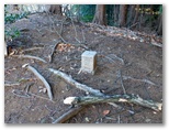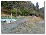 その坂道に入り、道なりに進むと、左手に神社があり(小津神明神社)、ボンゼン山の取りつき地点をすでに通り越したことが分りました。来た道を戻ってみましたが、取りつき点が不明です。でもここしかないだろうと見当をつけ、畑地の隅からヤブ道に入りました。すると小さな墓地があり、ヤブ道はその参道のようです。この墓地の先に道形は見つかりませんでしたが、そのまま尾根に向かって斜面を登りました。よく探せば、どこかに道があったのでしょうか?