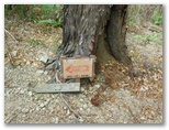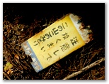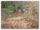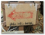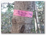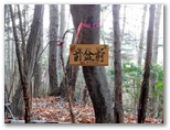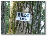 高留沢ノ頭(589m)で尾根のT字路に突き当たります。左(南東)に下れば陣馬街道に下り立ち、きょうの山歩きは終了。余裕綽々で帰宅できるでしょう。もちろんそんな気は全くないのですが、エスケープルート(緊急下山路)の候補として確認だけしておきます。逆に右に進めば、武蔵五日市駅まで長い道。下山路の候補は4本ほどありますが、きょうは最も安全・確実な道を下りるつもりです。ところで、高留沢ノ頭の私製標識は、生木にねじ釘を打ち込んで留められていました!