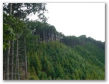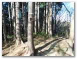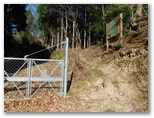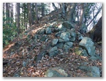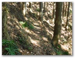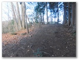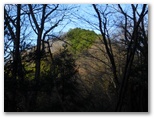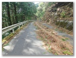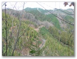 さて、その570m+峰からの下りは、きょう最もイヤな下りでした。ヤブっぽく、急で、落ち葉つきです。眼前に立つ鳥切場と、林道盆堀線とを見比べながら、プランの変更を考え始めました。言い訳はいくらでもあります:疲れた足と神経を休めたい、より安全である、時間を短縮できる、繰り返すアップダウンに飽きた、等々。そうこうするうち、落ち葉で滑って尻もちをつきそうになりました。きっぱりと、鳥切場を巻いて林道を歩くことにプランを変更します。