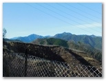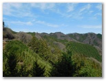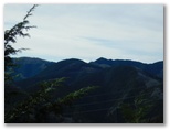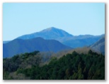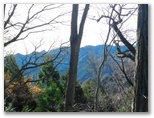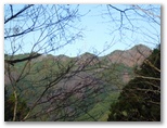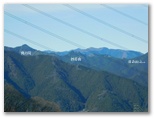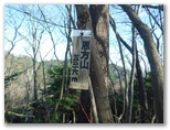 地図を確認して右折すると、そこは激下り。と言っても長くはありません。バランスを崩さないように下りきって、また登り返します。510m+峰、490m+峰と越えた先で、尾根が岩稜っぽくなり、そこを登り切るとすぐ、標高536mの恩方山でした。私製標識が二つ、針金で立ち木に緩く取り付けてあります。この針金が幹に食い込まないよう、誰かが緩めてやったのでしょう。私製標識の取りつけ具合は必ず見るのが、私の習慣です。恩方山頂では、丹沢三峰を望めました。
