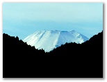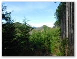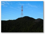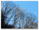 その先はなだらかな山道が続き、不動山(570m+)は知らぬ間に通り過ぎました。左手(南西面)に伐採地が現れ、大岳山の特徴ある姿が望めました。またトッキリに立つ赤白の送電鉄塔(新多摩線82号)が、よいランドマークになっています。さらに行くと、左手に富士山が見えていることに気付きました。見えるのは真っ白な頭だけです。そして570m+峰に立つと、前方に展望がありました。戸倉三山縦走路と並行する鉄塔82号(赤白)~86号、山腹の林道盆堀線もくっきり望めます。