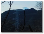 入山峠から再び山道に入ります。刈寄山は現在、下山路に工事現場があるらしいので、計画時点で却下済み。今熊山方面に進みます。これより先、巻き道のある峰はすべて巻きます。ただし、豆佐嵐山だけは頂を踏みました。丹沢と富士山を眺めるためです。まず丹沢ですが、見えてはいたものの、木々の枝が邪魔で、撮影は難。でも富士山は頭の先をしっかり望めました。ここでフレンチトーストの残り半分を食べます。レモンティーもまだ熱々。すべて順調です。