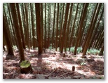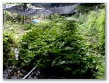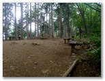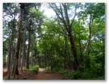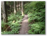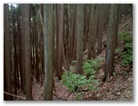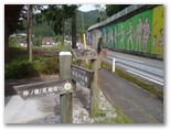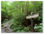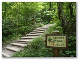 白孔雀の滝を後に、上流に進みます。まだ幾つかの小滝が見られましたが、きれいな小滝はめっきり減りました。歩くと、沢の底から泥が舞い上がったりもします。やがて、低木の枝がゴチャゴチャと茂って、楽しく歩けなくなったので、登山道に上がりました。整った登山道をスタコラ登って行きます。最後に丸木の土止め階段を登りきると、林道を横断しました。ベンチがコの字に置かれた休憩所があります。腰を下ろし、靴と靴下と帽子を山歩き用に替えました。