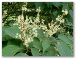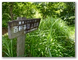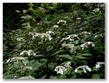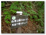 藤懸の滝を巻き終えると、また小滝が続いていました。鮮やかな苔やシダに飾られて、美しい絵になっています。優し気な白い花はヤマアジサイ。ここでは、サワアジサイと呼びましょう。モミジガサやイワタバコなどもありましたが、花はもう少し先のようです。岩に着いた緑色の苔はOKなのですが、赤茶色の苔は滑るので要注意。気が付くと、沢沿いに付けられた登山道を歩く人々が、どんどん登って行きます。道が沢を横切る地点には、たいてい道標がありました。