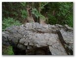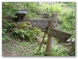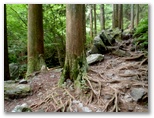 休憩所から岩茸石までは、0.4kmです。始めの急登を過ぎると、残りはほぼ水平の道だったので、楽々と岩茸石に到着しました。ここに来たのは46年ぶり。今回はひとつ上ってみましょう。高さは約5m。左側から容易に上れます。上ってはみたものの、どうと言うこともなかったので、すぐに下りました。権次入峠に向かいます。道標によれば、岩茸石から0.6km。ここから先は本格的な登りです。多少汗をかきましたが、左の谷からの涼風のおかげで、苦も無く登れました。