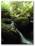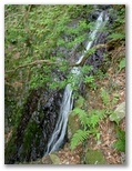 鎖場の手前から水流を辿れば、白孔雀の滝の下に出られます。その前に小滝がありますが、その岩が赤茶色の苔でヌルヌルしていました。上ることはできますが、白孔雀の滝の下からここに戻るときに難儀しそうです。跳び下りるのも危なそうなので、あっさりと諦めました。鎖場を登ります。登山道から白孔雀の滝を覗くと、一条の白い滝が黒い岩をなめ気味に落ちていました。きっと水量の多い日に、白い孔雀がどこかに現れるのでしょう。
