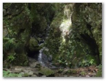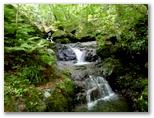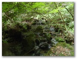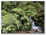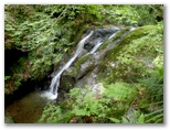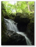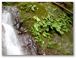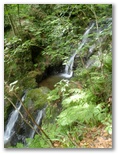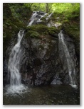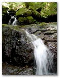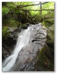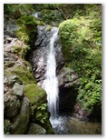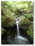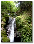 きょうは沢の流れが少な目なのかも知れませんが、ジャブジャブするには十分です。小滝があれば、できるだけ水をたくさん浴びるように上って行きました。緑の苔がとてもきれいです。もしかして、ヒカリゴケ?(いいえ) 始めの10分は足慣らし、と思っていたら、早くも藤懸の滝に至りました。2条の細い滝が2段に落ちています。下段は容易に上れましたが、上段は一目見て巻くことにしました。藤懸の滝とは風流な名ですが、春にヤマフジが咲くのでしょうか?