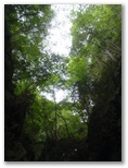 ゴルジュとは、岸壁に挟まれた隘路を言いますが、左右の岸壁が巨大であるほど、スリル感が増します。ここ白谷沢のゴルジュもなかなかの迫力。山歩きの人も、沢歩きの人も、この隘路を通過します。このゴルジュで、きょう初めて「こんにちは」を交わしました。前方に鎖場が見えます。鎖を手に、後ろ向きに下りる女性と、その人の通過を下で待つ人がいました。頭上を見上げると、左右の黒い岸壁の上に緑の木々が繁り、その間に狭い空が見えました。