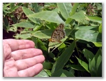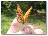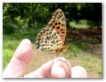 私はその場をいったん離れ、大きなヤマザクラの下で涼を取りました。数分後、彼の縄張りに戻って、左手を差し出すと、すぐに乗って来ました。ストローの先で私の指先をスキャンしているように見えます。すっかり夢中になったようなので、左手を引き寄せて、右手のカメラで撮影しました。これが上の写真です。ついでに動画も撮影しましたが、これはピント外れになっていました。こうしてしばらくの間、至近距離でツマグロヒョウモンの行動を観察しました。