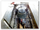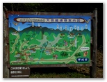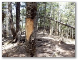 ここ「北岸」から林道をどちらに進めばダムに行けるでしょうか? 地形図をよく見ると、石丸峠方向に進めば、湖の東岸に破線表示されている広めの道に接続しそうです。よし、これだ。ベンチから3分ほど歩くと、右に遊歩道(?)のようにきれいな道が分岐していました。しめた、と思ってその道に進むと、奥まった入り江にぶつかりました。金網のフェンスで通せんぼがしてあります。警告板もあります。「あぶない!! この先は危険ですので立ち入らないでください。」
