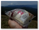 福ちゃん荘 - 大菩薩峠 - 大菩薩嶺を頂点とする三角コースは、よくできていると思います。自然の中にいる喜びを最も多く与えてくれたのが、唐松尾根でした。福ちゃん荘の前で腰を下ろし、お茶休憩にします。ここの寒暖計を見ると、19.7℃。と、頭上でエゾハルゼミが鳴き始めました。小さなセミですが、昼寝の夢をも破らんばかりの大音響! 全力の婚活です。お土産に、山ぶどう羊羹を見て衝動買いしましたが、これ、山梨県産の山ぶどうで作ったものでしょうか?