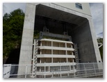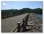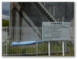 以後、美しい湖水を右に見ながら、舗道をテクテク、上日川ダムまで歩きます。キラキラ輝く湖面は、空の青を映して真っ青。ダムの手前、取水口ゲートにやって来ました。水利使用標識に、取水量210m³/s(毎秒210トン)とあるように、大規模なものです。そしてダムまでくると、おやおや、門が施錠されていました。ここまで歩いて来た道は、一般開放されていなかったのです。やむを得ず、少し戻り、監視小屋(?)のわきへ下りてから、ダムの積み石を登りました。