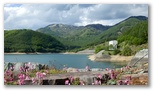 堤頂に立つと、湖の奥に大菩薩嶺を望めました。先ほど大菩薩湖を見下ろした嶺。今、湖から見上げています。大菩薩嶺も私を見ているような気がしました。こうして見渡すと、大菩薩嶺は水源林でもあることが実感できます。ダムの堤頂にはコマクサが植えられ、ピンク、赤、白の可愛い花をつけていました。どこかでカッコウの鳴く声。積み石の一つに腰を下ろし、とっておきのお菓子とお茶を取り出します。バスは1本見送り、心もお腹も満たされるひと時を過ごしました。