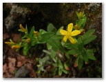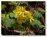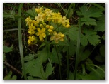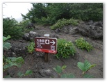 古御嶽(こみたけ)神社の石段を昇り、小さな社殿の右から登山道に入ります。一見普通の山のように緑の木々と下草が生い茂っていますが、登山道にだけゴツゴツした溶岩が露出しています。さっそく、キンレイカ、オトギリソウ、キオン、ミヤマアキノキリンソウなど、いずれも黄色の花が咲いていました。[登山道] と [下山道] を示す赤い標識がありますが、須走ルートではこの赤い色が目印になります。