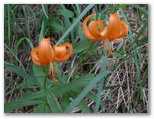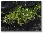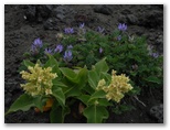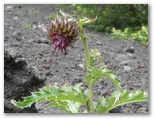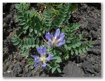 森にはダケカンバやカラマツなどが多くあります。面白いのは、ダケカンバはみな樹幹が山麓側に傾いているのに対し、カラマツの幹はピンと直立していること。そのカラマツもだだっ広い砂礫地では、枝だけが山麓側を向いていて、受ける風の凄まじさを思わせます。溶岩混じりの砂礫地には、紅白のイタドリ、オンタデ、ムラサキモメンヅルなどが咲き、少しでも土壌のある場所では、トモエシオガマ、シロバナノヘビイチゴ、クルマユリなどが咲いていました。少し予習してきたので、見つけるのも楽しみです。