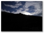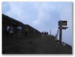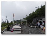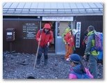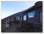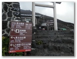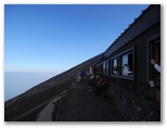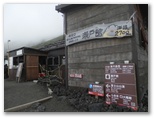 五合目から約4時間で、七合目の大陽館に着きました。ここで再び小休止。標高3,090m、山頂まで2.8km、160分とあります。その山頂が霧の合間に見え隠れしていました。そのうち晴れるんじゃないかな、とは私の希望的観測。小屋の入口に、「予約なしでも宿泊できます。当館の営業は10月15日までです」とありました。トイレ使用料ですが、宿泊者は無料、外来者は500円程度のチップ、と独特な設定です。「トイレの維持管理に通常より多くの費用が必要」と書いてありました。