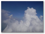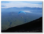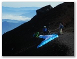 再び大沢崩を見下ろす場所にやって来ると、パラグライダーを準備している人々がいました。3人です。その一人はすでにハーネスを装着し、翼の操縦索を点検していました。腰を下ろして見学させていただきます。その人は時々小石を投げて、砂埃の立ち方を見ていました。約10分経った頃、いよいよ駆け出しました。富士山の、しかも大沢崩の上から駆け下りるのです。凄い度胸! 青い翼が開きました。「行きます!……行けます!」そしてフワリ空中に浮かんだかと思うと、見る見る身延平野の方向に飛んで行きました。