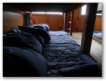 宿泊の手続きを済ませると、寝場所に案内されました。翌日の出発予定を午前3時と伝えておいたことに由るのだと思いますが、二段蚕棚の下の段、通路の最奥の寝袋に案内されました。暖かく、よく休めそうな寝具があります。荷物と靴袋はすべて上のフックに掛けるように言われました。私は発熱性の下着を着込み、靴下を脱いで新しいものを用意し、帽子を冬山用に取り替えました。ヘッデンも取り出しておきます。