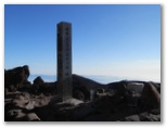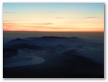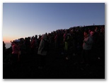 午前4時5分、ようやく山頂の鳥居をくぐり、須走口・吉田口山頂に立ちました。最高地点ではありません。でもそこは誰にとっても一つの明確なゴール地点。登頂を果たした喜びに抱き合っている人々、握手して健闘を称え合っている人々などで大賑わいでした。私は久須志神社と休憩所などの立ち並ぶ、明るい富士山銀座を抜け、[須走口下山道]標石の向こうまで行って、ご来光を待つことにしました。すでに東の地平線は赤熱しています。風は微風。この上なくおだやかな空気を感じました。