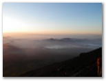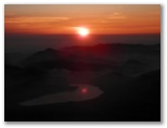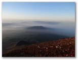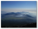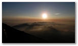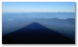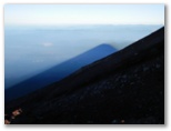 しばらくウトウトすると、「絶景だ!」の声で目を覚ましました。外に出ると、裾野まで霧が晴れ、河口湖、山中湖と周辺の里や森がきれいに見えました。山小屋の窓からは一斉にカメラの列。山頂も霧が晴れ、青い空と白い雲にくっきりとシルエットを望めます。今しも本八合目のあたりに太陽が隠れるところ。さあ、運良く影富士が見られるかもしれません。