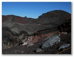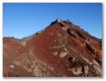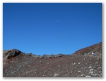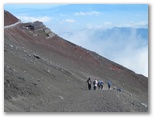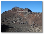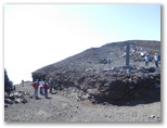 山頂のお楽しみ、お鉢巡りに出かけます。順路は一周約3km、90分ということですが、日本最高の場所にいるのですから、急がずじっくりと見て周りましょう。まず最初に大内院と呼ばれる噴火口の底をのぞいて見ました。巨大なすり鉢は、アリ地獄のように砂礫や岩石が崩れ落ちそうで怖い。赤茶・黒・白の噴火口は、普段見る青・白・緑の富士山のイメージとはかけ離れた異界。見れば見るほど、「富士山はやはり火山だ!」という思いが強くなりました。モルゲンローテの剣ヶ峰が、ちょうど真向かいに聳えています。
