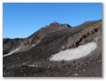 [本七合目 ⇒ 200m] の標識を見たあたりから、微妙に足が重くなりました。筋肉の出力が低下し始めたようです。血中酸素の不足によるものでしょう。ここは慎重に、見晴館で長めの休憩を取りました。標高3,200m、山頂まで2.0km、130分とあります。私が予約した八合目の下江戸屋までは、わずか420m、30分。ここまで来ると、山頂の建物まではっきりと見えるようになっていました。