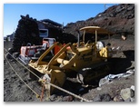 本六合目 "Original 6th Station" の瀬戸館では、腰を下ろして休みました。標高2,700m、山頂まで4.0km、220分とあります。張り出されたメニューの、ご飯もの1000円、うどん800円、カップ麺600円、焼印200円は、富士山の山小屋での相場でしょう。食材や飲料は、重機のような無限軌道を持つ車両(クローラー)で運び上げたものです。その車両は定められた時間内にブルドーザー道を行き来しますが、一部は下山道と共用になっています。