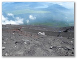 七合目から3分ほどで、砂走りが始まりました。楽しみにしてきたところなので、調子よくザクザクと下って行きます。前のグループに近づきすぎると、モウモウたる後塵を拝する羽目になるので、50mほど距離を置いて下り、抜くときは一気に抜き去るようにしました。角張ったゴロ石もたくさんあるので、転倒しないよう十分注意しなければなりません。午前10時半、砂払い五合目の吉野屋前で一休みしました。