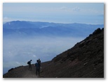 富士山頂奥宮をさっと表敬訪問し、剣ヶ峰に向かいました。岩に鉄分が含まれているのか、この辺りは赤茶色です。山頂直下の急傾斜を登り始めると、富士山の左に、その稜線の影が見えました。勝手に名づけて二重富士(ふたえふじ)です。昨晩見られなかった影富士が見られそうだと思ったので、山頂に急ぎました。ところが馬の背と呼ばれるこの急登はザレ気味で、足をしっかり斜面に押し付けて登らないと、ズルズルと滑ってエネルギーを消耗します。
