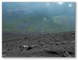 登山道で出合う人は極めて少なく、ときどき誰も見えなくなりました。広大な富士山の山腹で、自分しか人影が見えないなんて、私が今まで抱いていた富士登山ラッシュのイメージとはかけ離れています。左手に開けた砂礫地の向こう側、「砂走り」下山道に目を凝らせば、砂塵を立てて下る人が時々見えました。