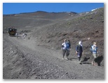 1時間ほど眺望を楽しみました。下山に備え、靴をしっかり履き、靴紐をしっかりと締めます。小石が靴に入るのを防ぐため、スパッツも装着。午前8時35分、下山の途に就きました。八合目までは須走ルートと吉田ルートの下山道は同じです。そこは幅広のブルドーザー道で、大きなゴロ石もなく、登山道とは比較にならないほど歩き易い道です。芦ノ湖、山中湖、河口湖などの眺望を楽しみながら、どんどん下りました。途中で2回、勇ましく登って来る運搬車と出合いました。