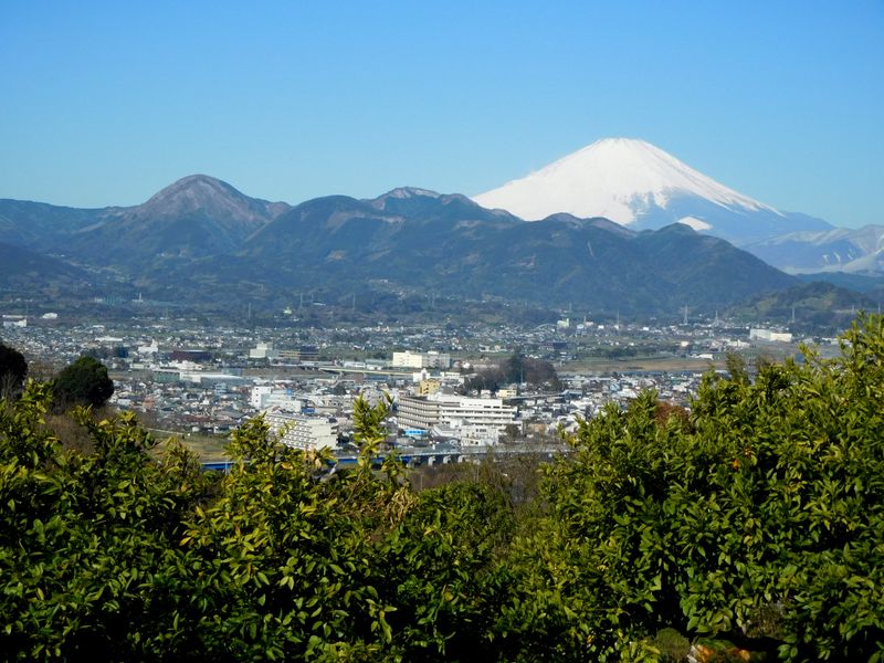 -- ミカン畑越しに、矢倉岳(左)と富士山。8:16