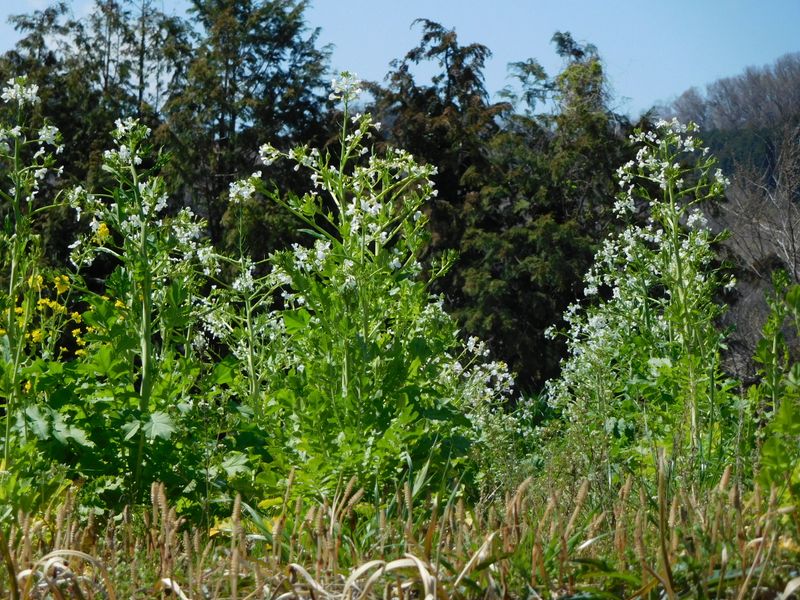 -- 大根畑には白い花。手前にツクシ。12:40