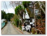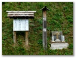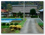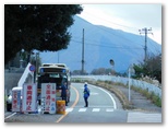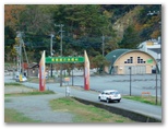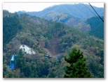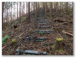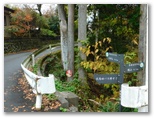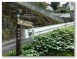 さて、帰りのバスの時刻が近づいてきました。平丸バス停へは、道志ダムに隣接する「青根緑の休暇村」を通り抜け、「痛恨の碑」の前から、すでに賞味期限の切れた「遊歩道」を登ります。普通の下山では、バス停へと下るのですが、ここでは上るのが面白いところ。途中で通過する市道は復旧工事中ですが、工事完了後は国道413号の臨時バイパスとして使うそうです。ようやく国道まで歩いて上ると、通行止めバリヤの向うで、三ケ木行きのバスが待っていました。